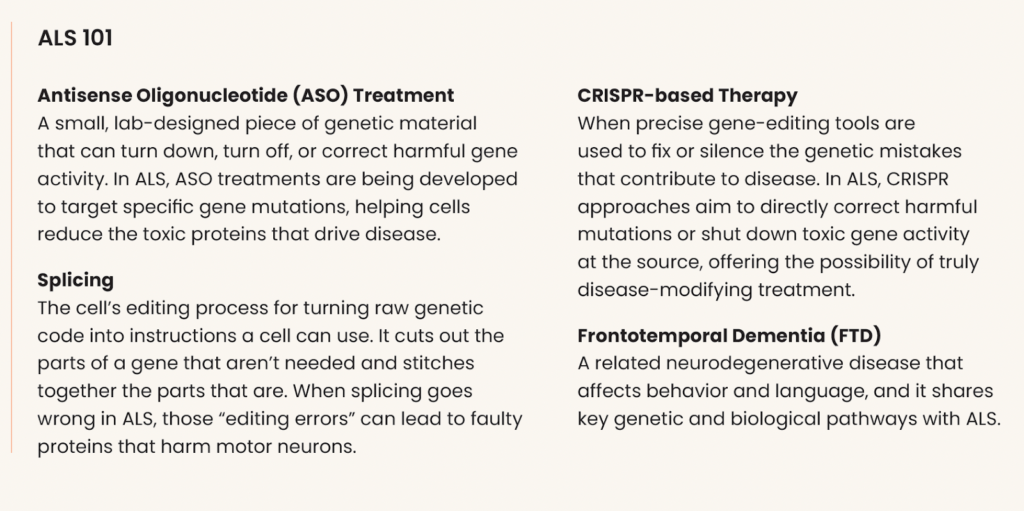 Key Take-Away: With support from Target ALS, Clelland is advancing one of the first personalized CRISPR strategies for ALS, combining proven gene-editing success with Denali’s innovative delivery platform to move this bold science closer to people living with ALS.