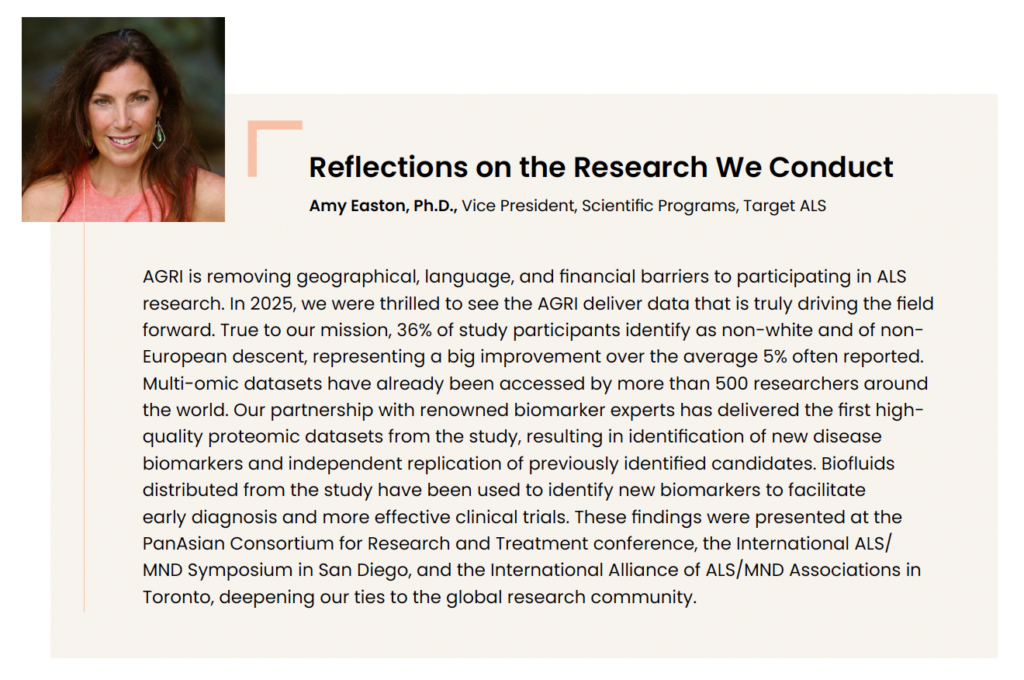 In 2025, we launched the AGRI webpage, a central resource showcasing our groundbreaking efforts to diversify and expand ALS research globally.