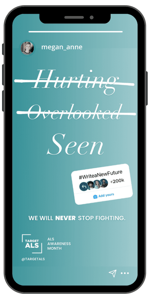 We’re optimistic now more than ever about achieving the innovative breakthroughs needed to end ALS, and for this year’s ALS Awareness Month, we want to inspire others to share optimism they have for their own future – whether they are a member of the ALS community, or not. Join us on Instagram Stories or Facebook Stories by downloading the background below on your phone, visiting our profile, and sharing how you’d like to #WriteaNewFuture for your personal journey. Don’t forget to tag our social handle, @targetals, in your Stories so we can follow along!